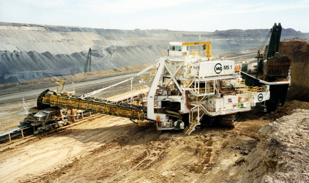 澳大利亞全移動(dòng)破碎站于2002年投入使用,整個(gè)破碎站設(shè)計(jì)能力10000噸/小時(shí),使用P&H 4100XPB電鏟直接給料。入料最大2400mm,出料350mm。行走速度0-12米/分鐘。出料皮帶可以左右各回轉(zhuǎn)60度,并可仰俯上15度,下-7度。