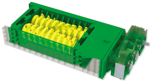 典型的3齒齒環(huán)MMD850篩分破碎機(jī)配備單臺400KW電機(jī),重量大約為40噸。